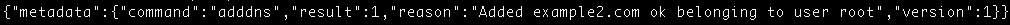 { metadata: { result: 1, version: 1, reason: 'Added example.com ok belonging to user root', command: 'adddns' } }